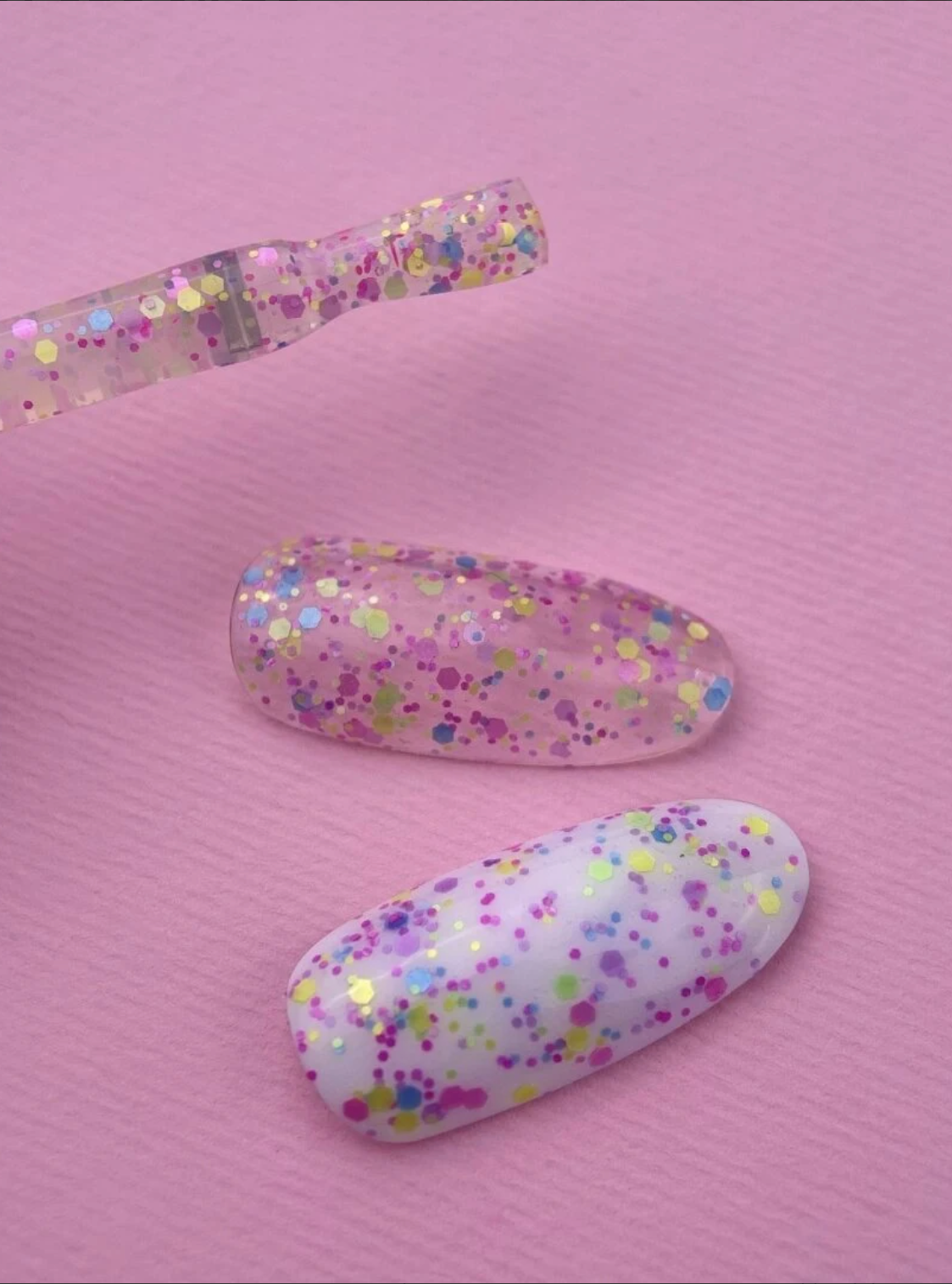 Top Confetti is a rainbow different shape and size glitter top coat without a sticky layer that will look great with any colour on your nails. It can make your manicure look interesting and unique.